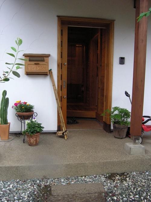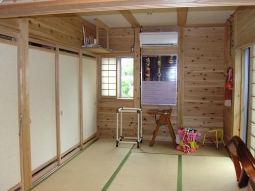 設計では、変形しても倒壊しづらい板倉構法を採用し、畳も無農薬畳表と藁床、襖も自然素材で製作しました。襖は上下に通気口を設けて湿気対策してます。